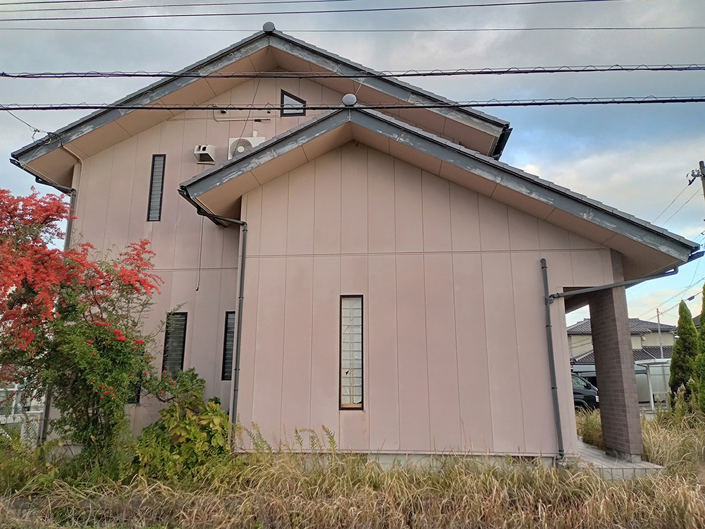 破風・外壁の色褪せが著しく、外壁部分はチョーキング現象もみられました。